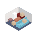 It fits furnishings of a mid-sized bedroom, including a queen-sized bed, a dresser, a TV and several small to medium-sized boxes.
